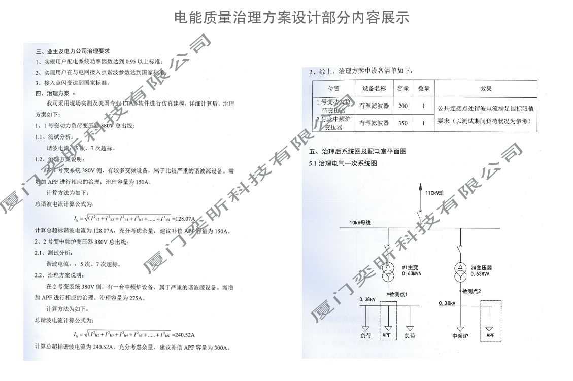 為用戶消除電能質量隱患、為設備和電網健康運行創造有利條件。防患于未然。針對于在“電能質量評估和電能質量檢測”中超標的用戶,為用戶提供整改方案由電力公司監督審核落實,以期達到提升電力用戶供配電系統用電效率、節能減排、降低設備的故障率和系統運行穩定性。提高電力公司供電可靠性、電網運行穩定性,提升電力用戶對電力公司服務的良好體驗感。為客戶提供專屬定制的供配電系統的解決方案。