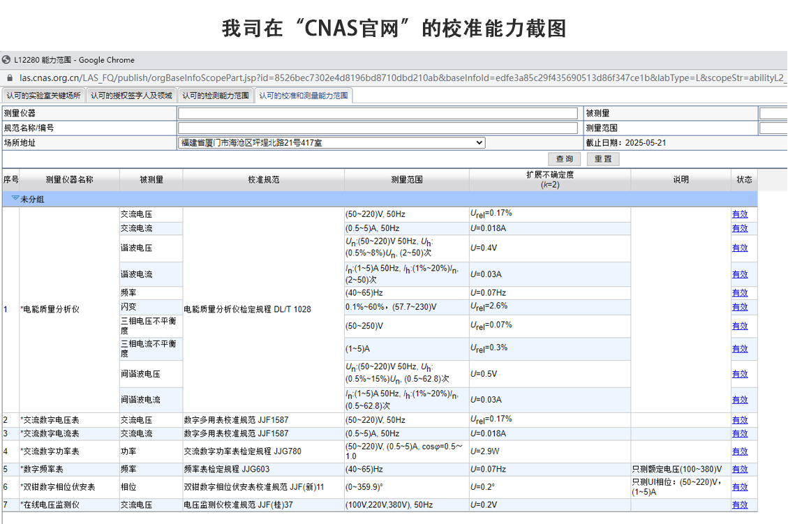 我公司具有電能質量分析儀(在線式和便攜式)、電壓表、電流表、相位表、頻率表等相關監測、計量和保護類表計類校準CNAS資質,可根據具體情況為客戶提供實驗室或現場靈活方式校準業務。